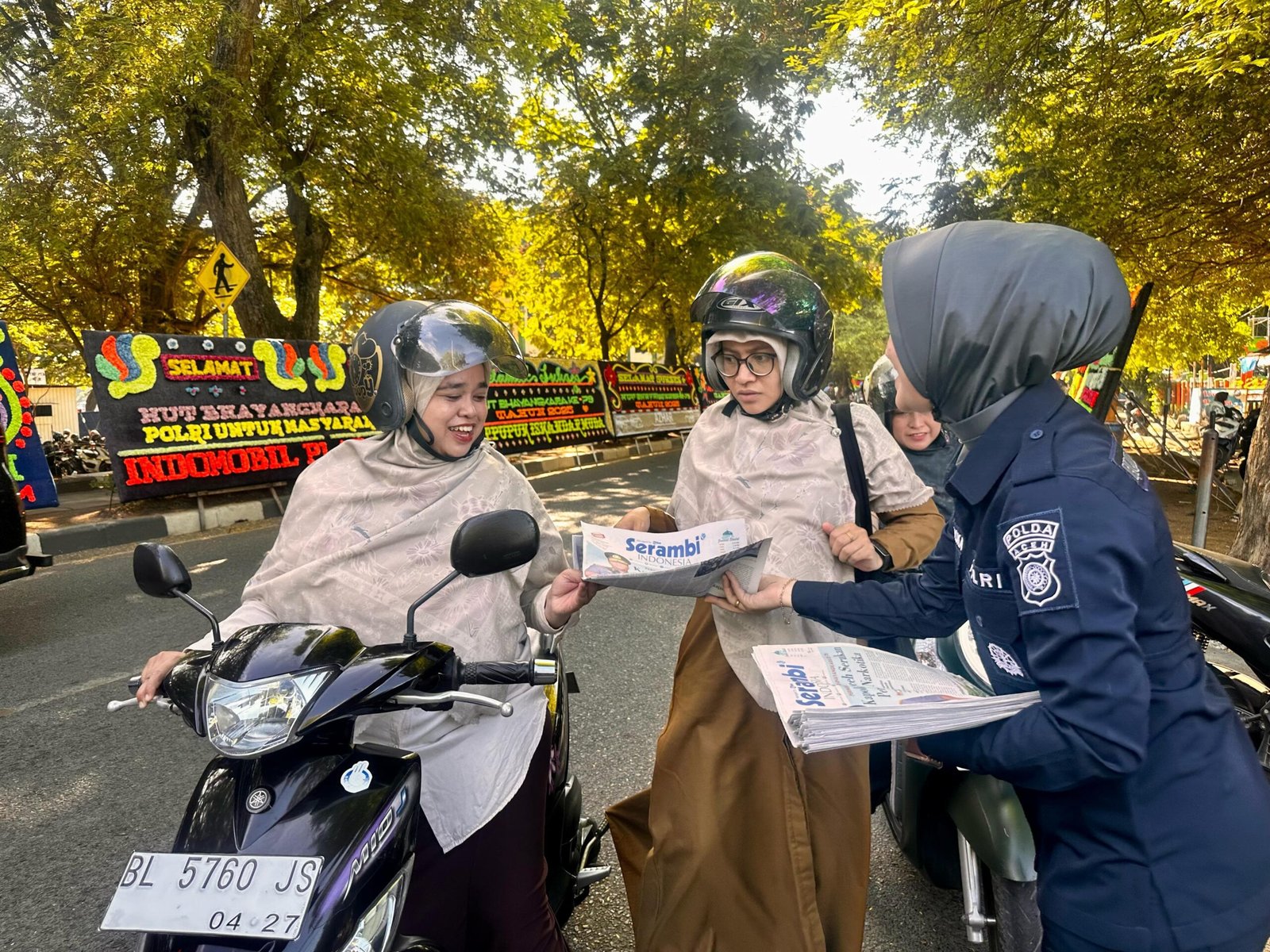 Acehreportase.id|Banda Aceh — Dalam rangka memeriahkan peringatan Hari Bhayangkara ke-79, personel Bidhumas Polda Aceh membagikan koran gratis kepada masyarakat di sekitar Lapangan Blang Padang, Banda Aceh, Selasa, 1 Juli 2025. Lapangan Blang Padang sendiri menjadi lokasi pelaksanaan upacara Hari Bhayangkara ke-79.