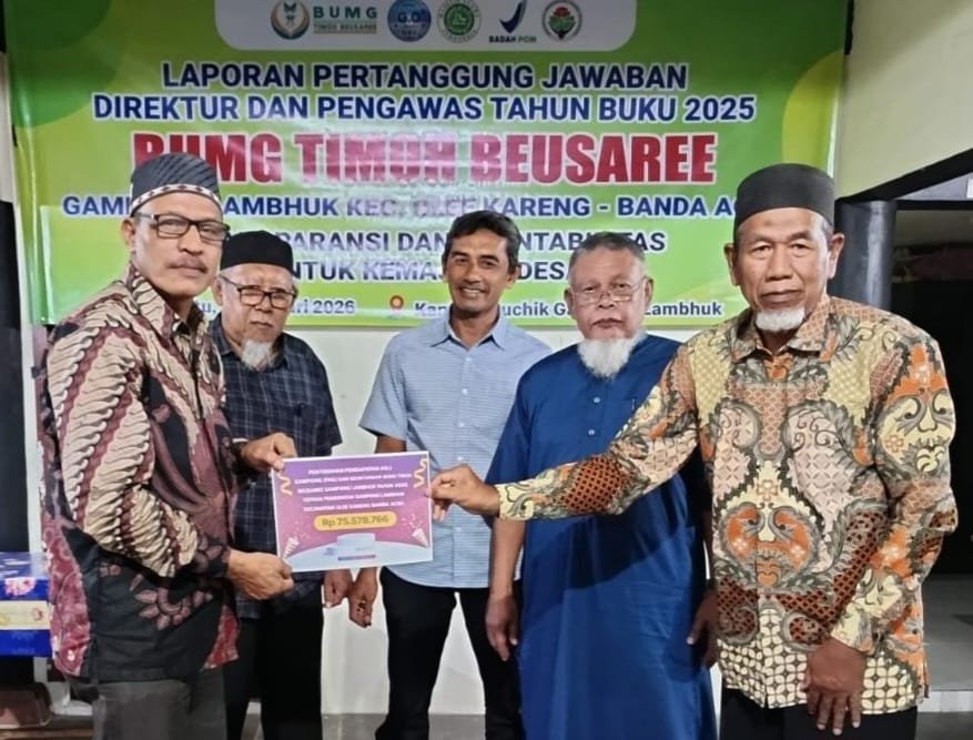 Acehreporrase.id|Banda Aceh – Badan Usaha Milik Gampong (BUMG) Timoh Beusaree Gampong Lambhuk, Kecamatan Ulee Kareng, Kota Banda Aceh, secara resmi menyerahkan Pendapatan Asli Gampong (PAG) yang bersumber dari keuntungan usaha BUMG untuk Tahun Buku 2025 kepada Pemerintah Gampong Lambhuk.