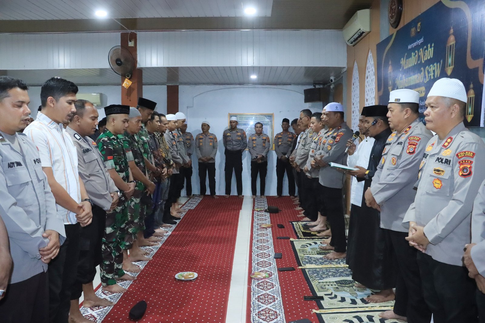Acehreportase.id|LHOKSUKON – Dalam rangka memperingati Maulid Nabi Muhammad SAW 1447 H / 2025 M, Polres Aceh Utara menggelar kegiatan doa bersama dan tausiyah keagamaan yang berlangsung khidmat di Mushalla Babuttaqwa, Mapolres setempat, Kegiatan ini dihadiri oleh jajaran Kepolisian, TNI, Dan tokoh agama. Jumat, (12/9/2025) Pagi.