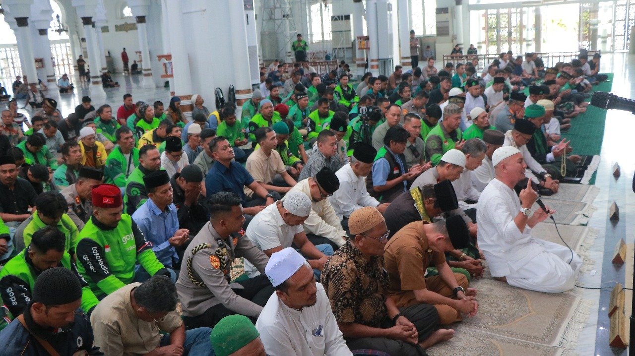 Acehreportase.id|Banda Aceh — Kapolda Aceh Brigjen Pol Marzuki Ali Basyah melaksanakan salat gaib, zikir, dan doa bersama Sahabat Ojek Online (Ojol) di Masjid Raya Baiturrahman, Banda Aceh, Selasa, 2 September 2025. Kegiatan tersebut juga diisi dengan tausiah yang dipimpin Ustadz Zul Arafah.