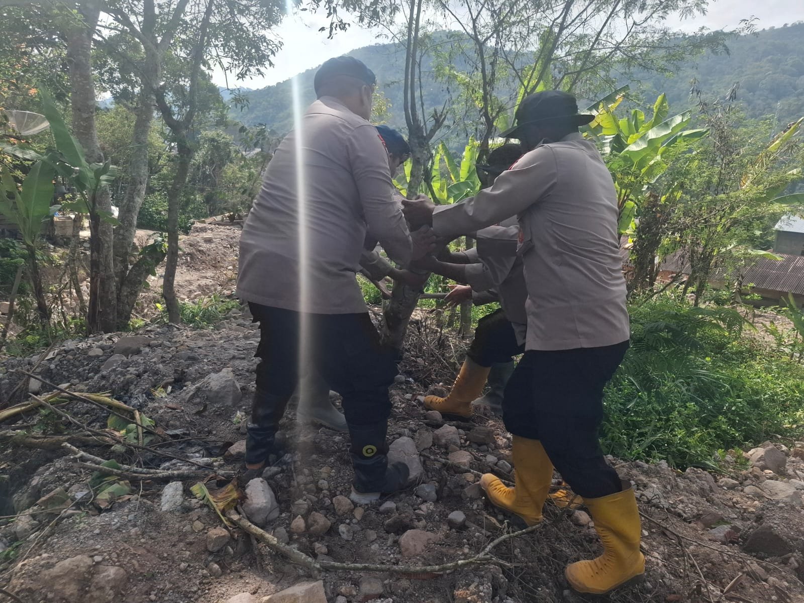Dengan semangat kebersamaan, personel Polri dan warga bahu-membahu menyingkirkan material longsor, memotong dan memindahkan pohon-pohon tumbang yang menutup badan jalan, serta memperlancar aliran air pada parit di sepanjang ruas jalan agar tidak kembali tersumbat.