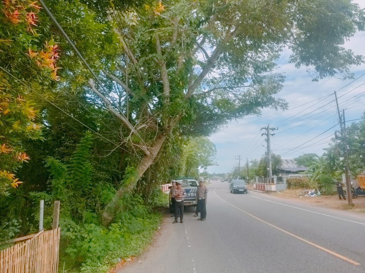 “Dari hasil amatan di lokasi, batang pohon memang tampak miring ke arah jalan dan berisiko tumbang, terutama saat hujan deras dan angin kencang,” ujar Iptu Sofyan Kurniawan.