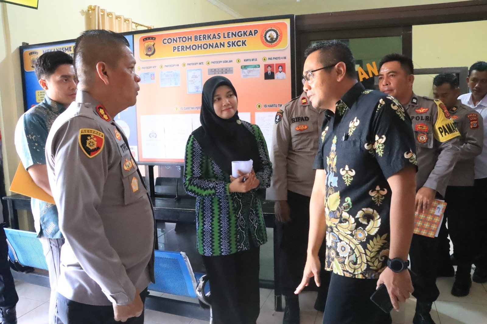 Selain memeriksa alur pelayanan, tim juga meninjau kelengkapan sarana dan prasarana penunjang, seperti ruang tunggu, fasilitas bagi penyandang disabilitas, dan informasi layanan yang tersedia. Tim turut melakukan wawancara terhadap sejumlah personel untuk menilai pemahaman serta kendala yang dihadapi dalam pelaksanaan tugas pelayanan.